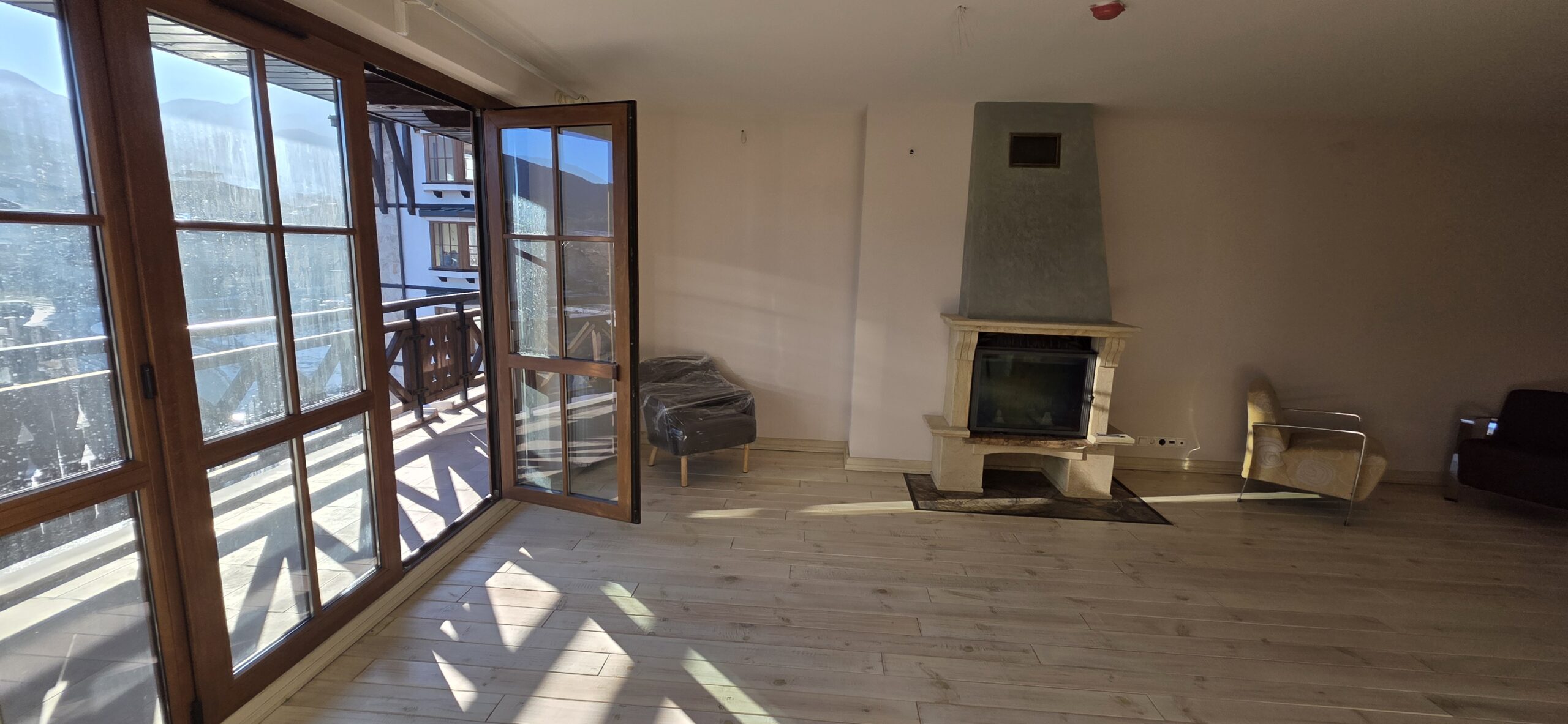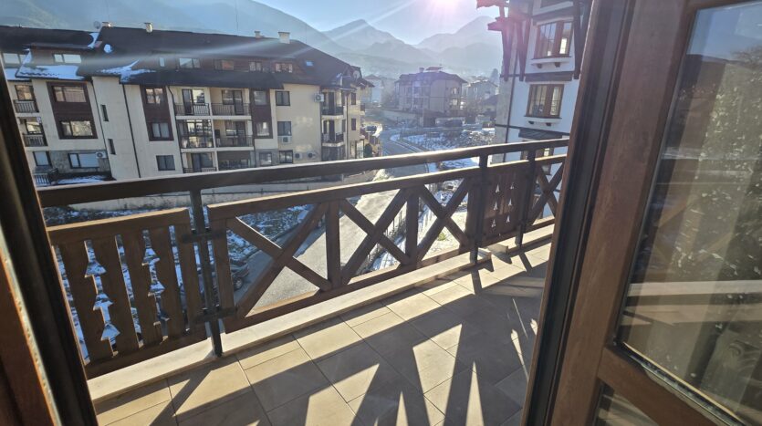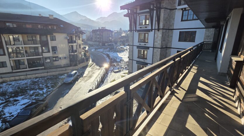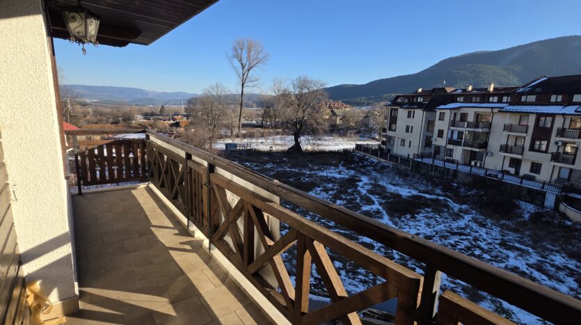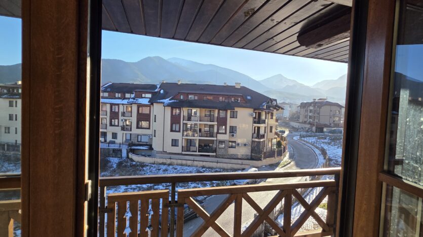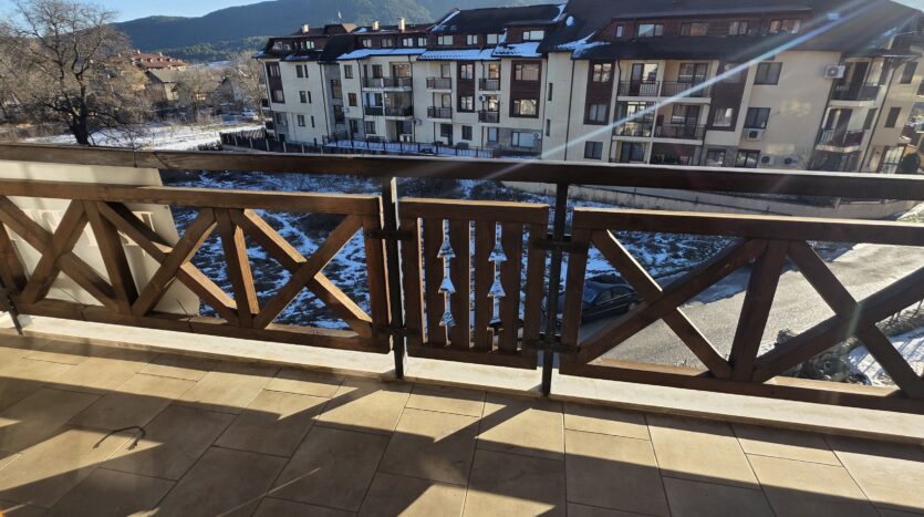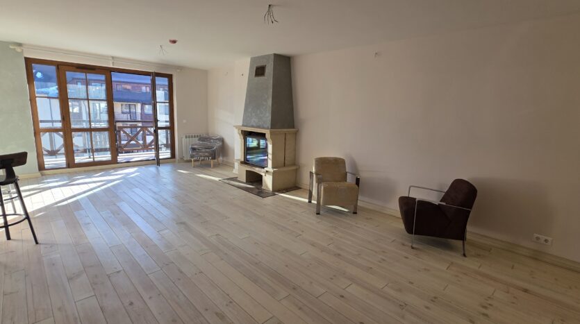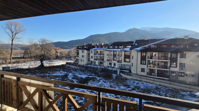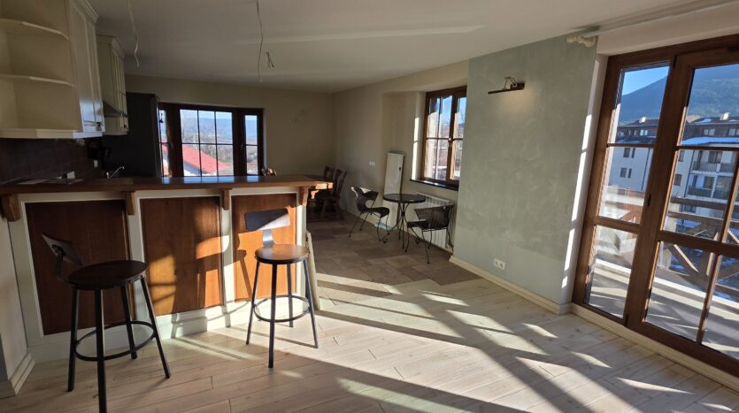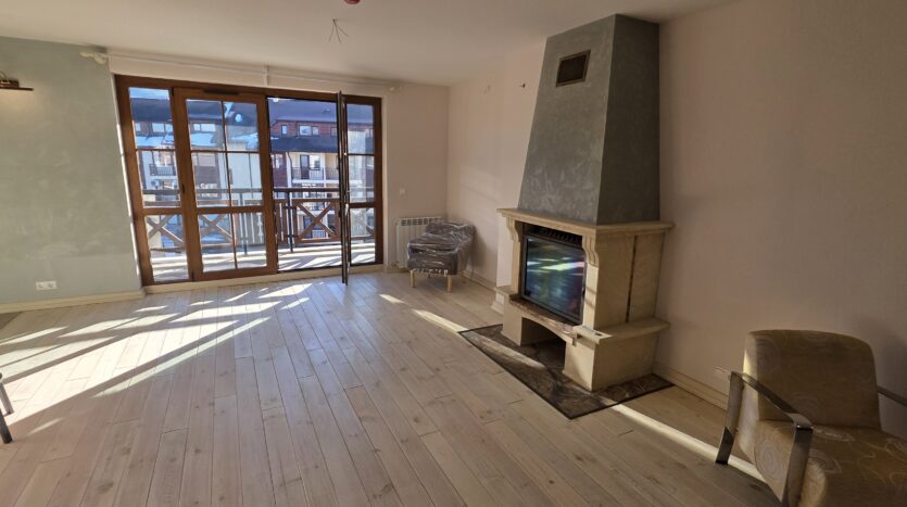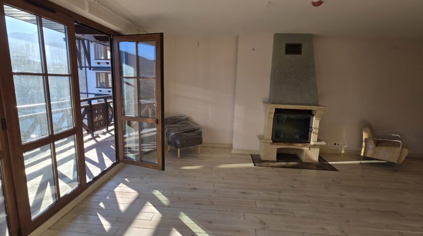 The apartment consists of an entrance hallway, spacious custom-made kitchen, made of solid wood fully equipped with an oven, gas stove, extractor and a refrigerator. The bright and spacious living/dinning area has a log- fireplace and is beautifully furnished with a dining table with chairs and armchairs. There is an access to a South-facing balcony with an amazing panoramic views of Pirin mountains. The main bedroom is furnished with a double bed and has an en-suite bathroom equipped with a bathtub, sink and toilet. The second bedroom is unfurnished, with two large East-facing windows. The second bathroom is equipped with a shower, sink and a toilet.