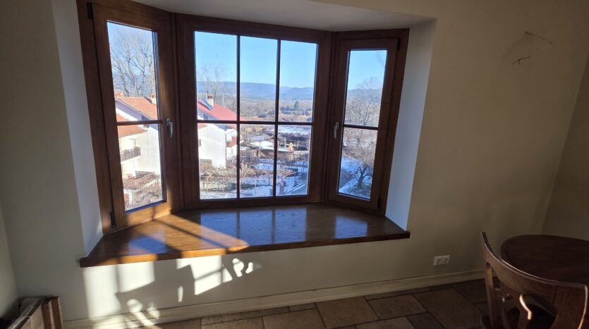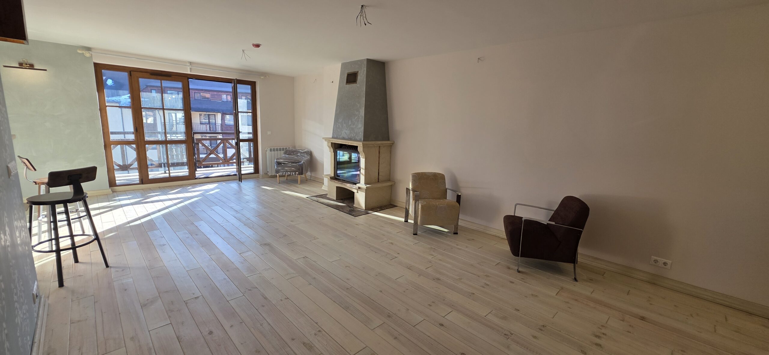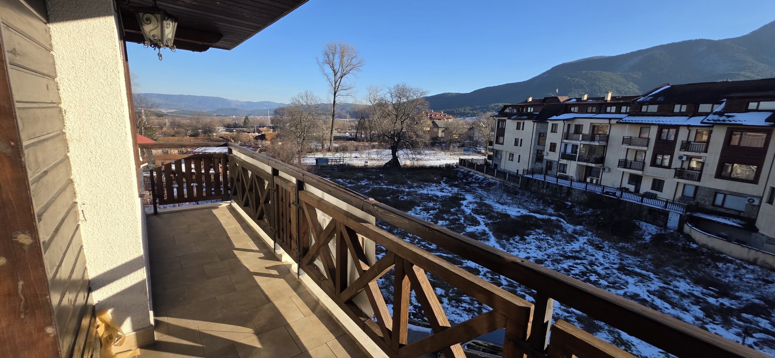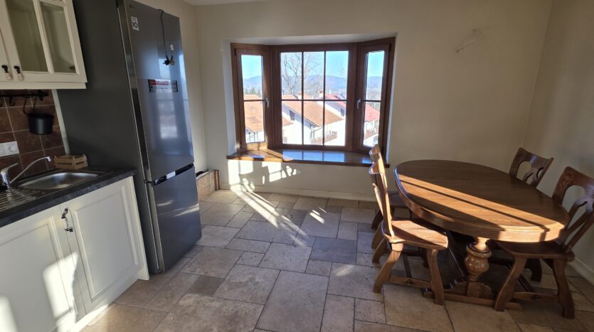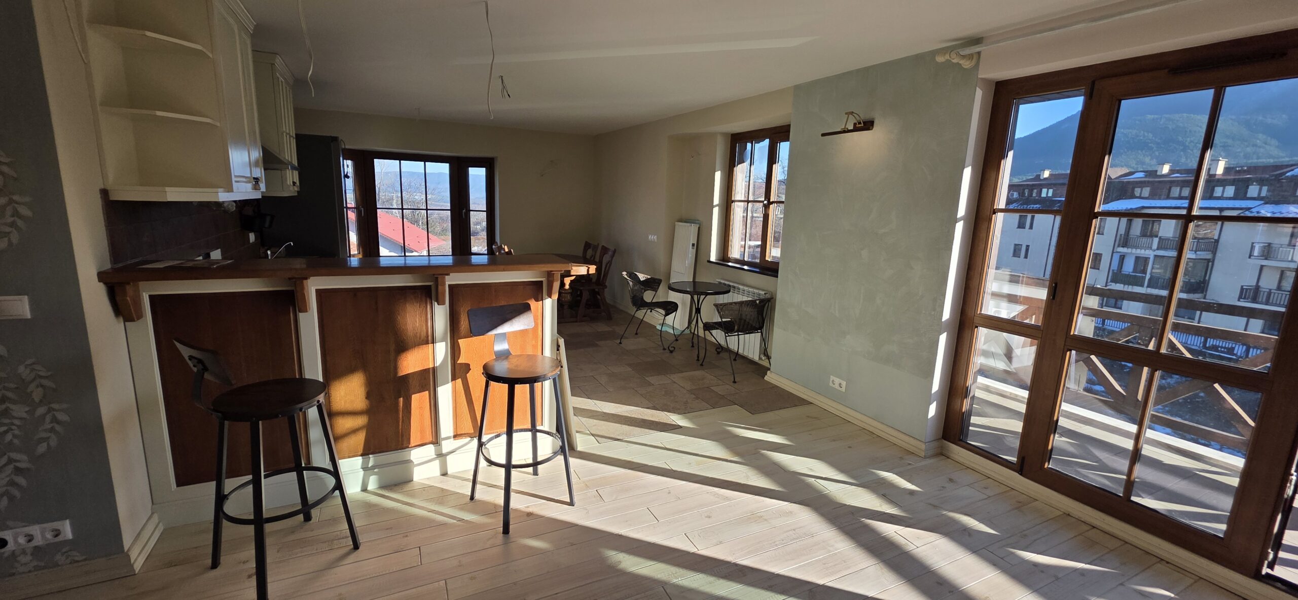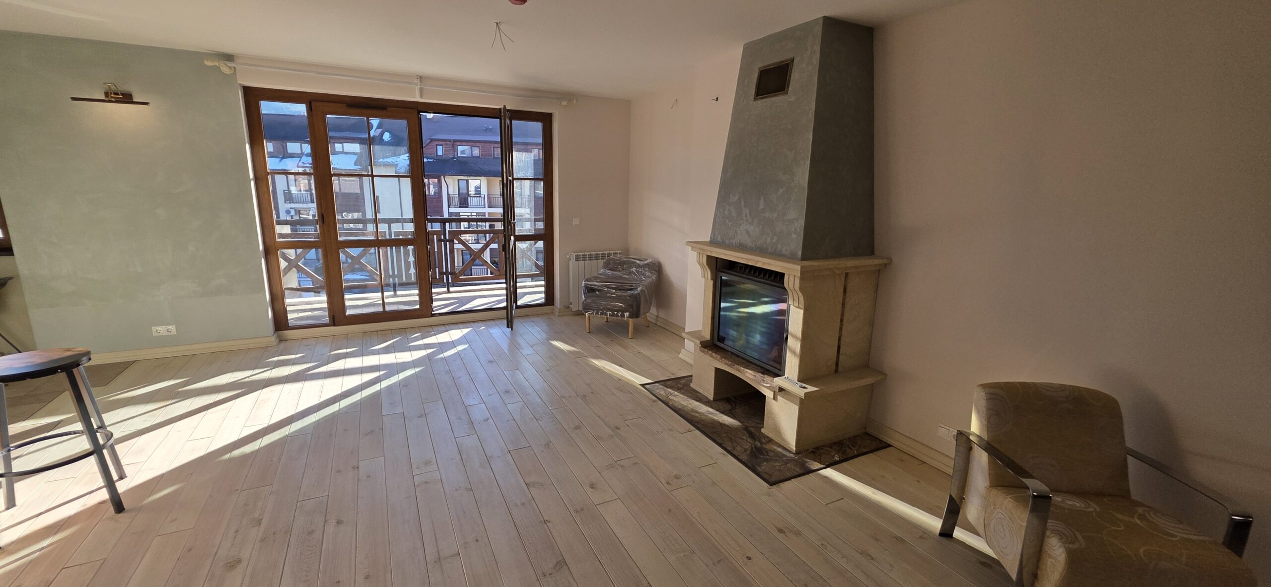 The apartment consists of an entrance hallway, spacious custom-made kitchen, made of solid wood fully equipped with an oven, gas stove, extractor and a refrigerator. The bright and spacious living/dinning area has a log- fireplace and is beautifully furnished with a dining table with chairs and armchairs. There is an access to a South-facing balcony with an amazing panoramic views of Pirin mountains. The main bedroom is furnished with a double bed and has an en-suite bathroom equipped with a bathtub, sink and toilet. The second bedroom is unfurnished, with two large East-facing windows. The second bathroom is equipped with a shower, sink and a toilet.