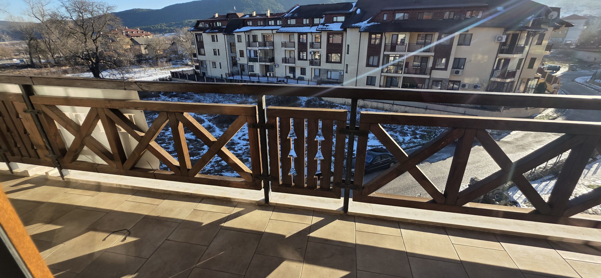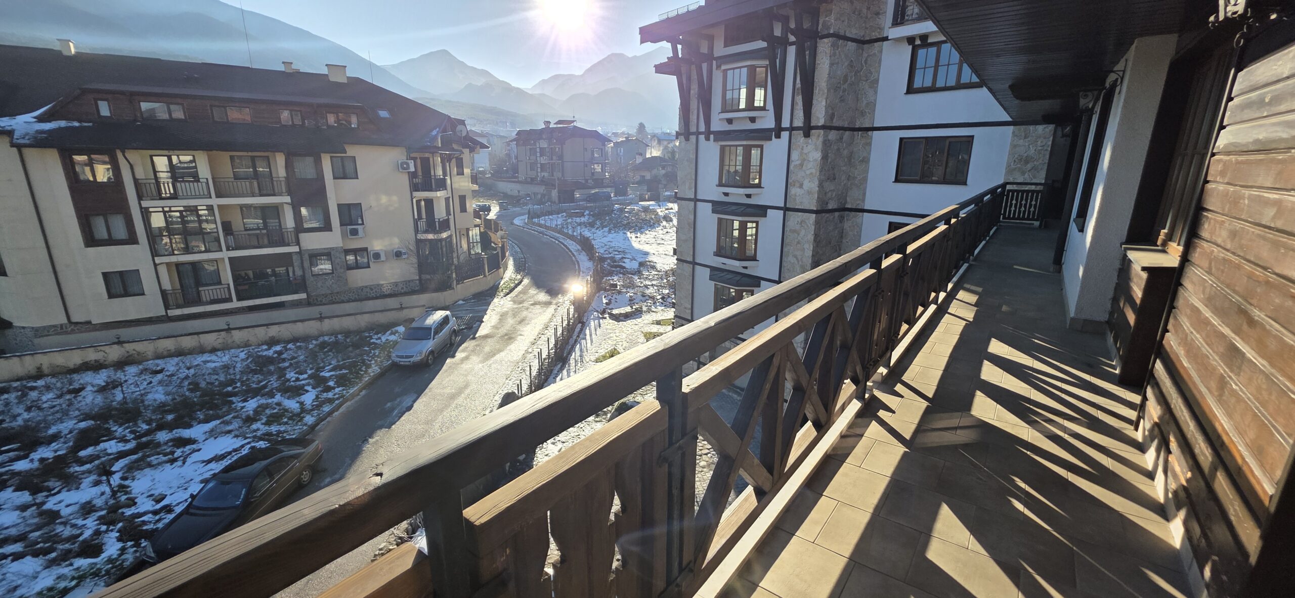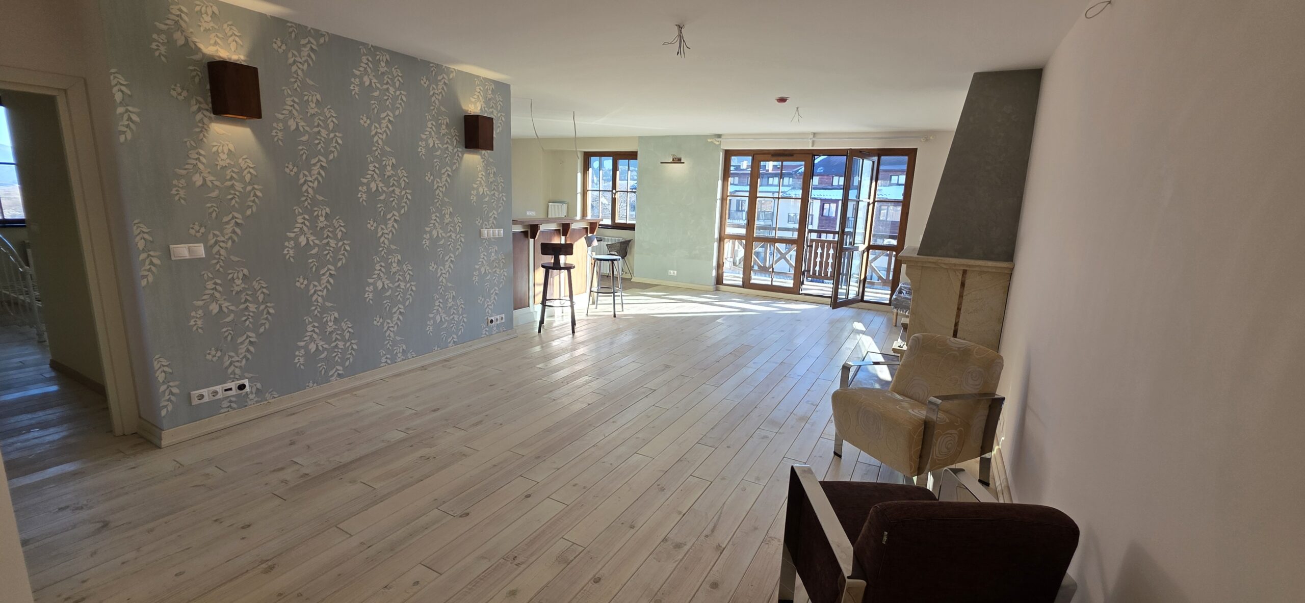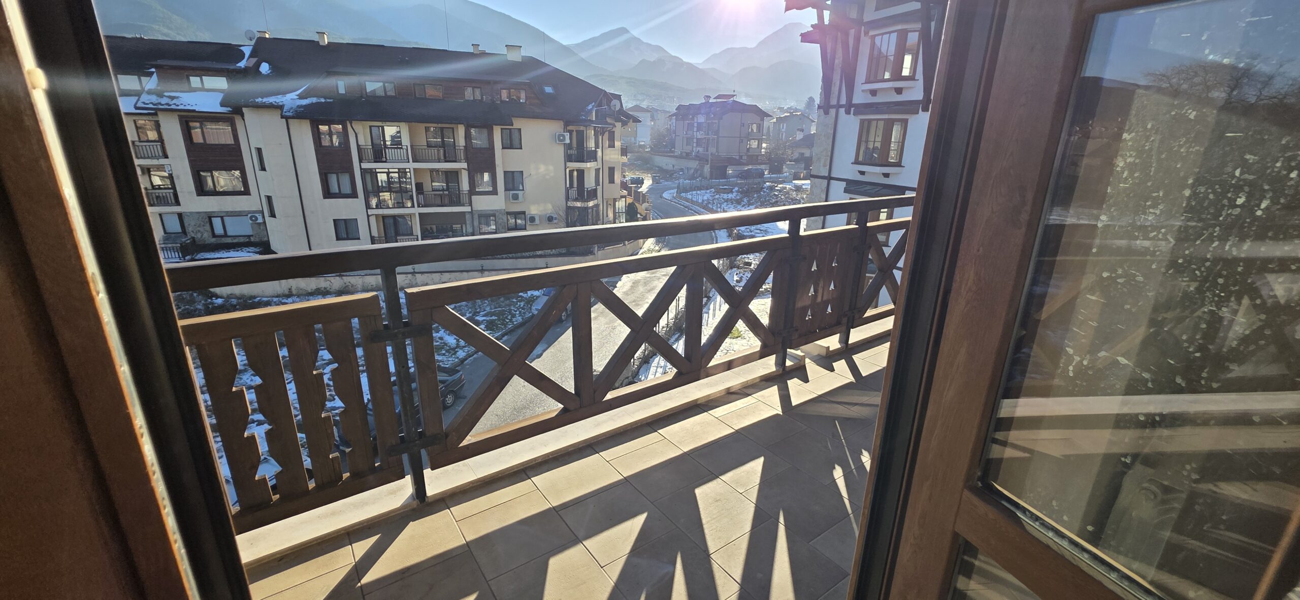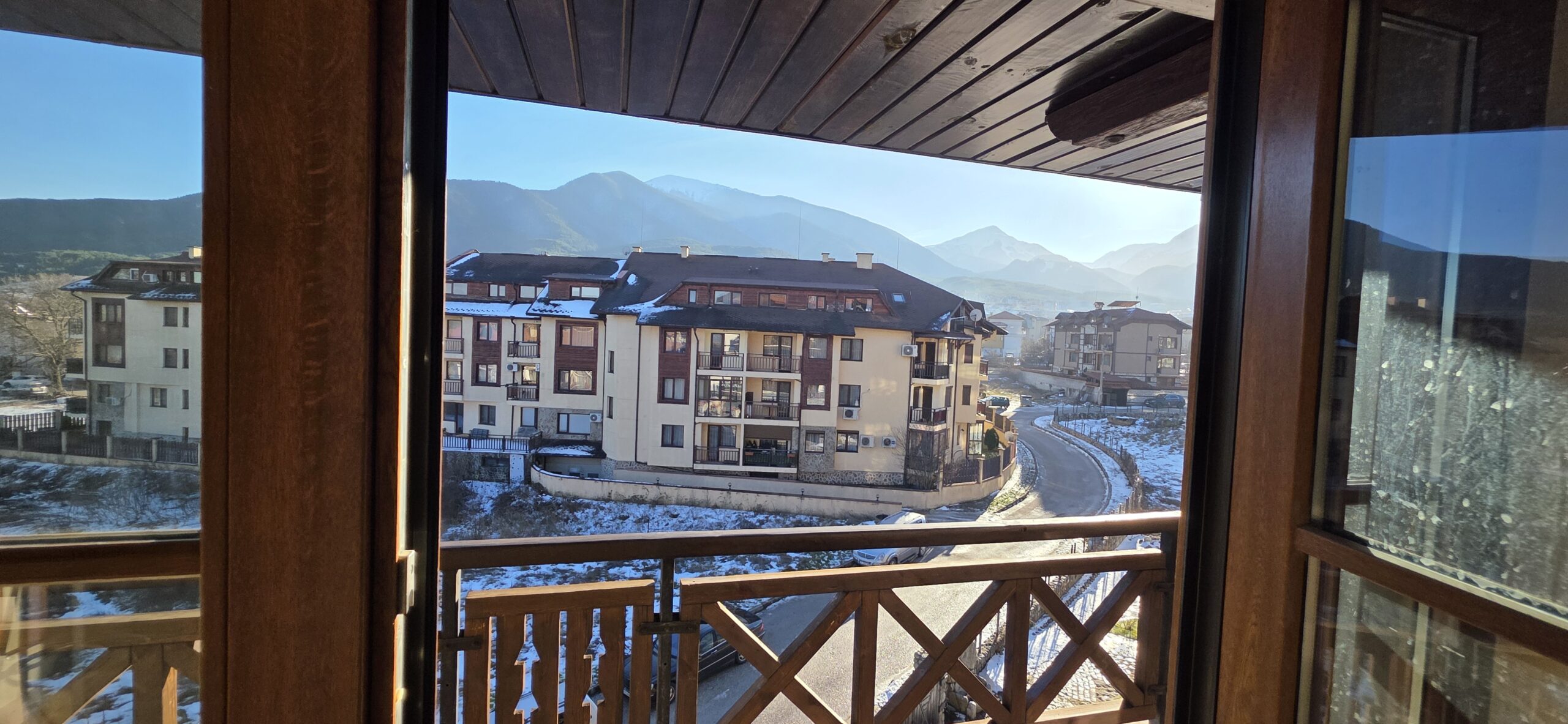 The apartment consists of an entrance hallway, spacious custom-made kitchen, made of solid wood fully equipped with an oven, gas stove, extractor and a refrigerator. The bright and spacious living/dinning area has a log- fireplace and is beautifully furnished with a dining table with chairs and armchairs. There is an access to a South-facing balcony with an amazing panoramic views of Pirin mountains. The main bedroom is furnished with a double bed and has an en-suite bathroom equipped with a bathtub, sink and toilet. The second bedroom is unfurnished, with two large East-facing windows. The second bathroom is equipped with a shower, sink and a toilet.