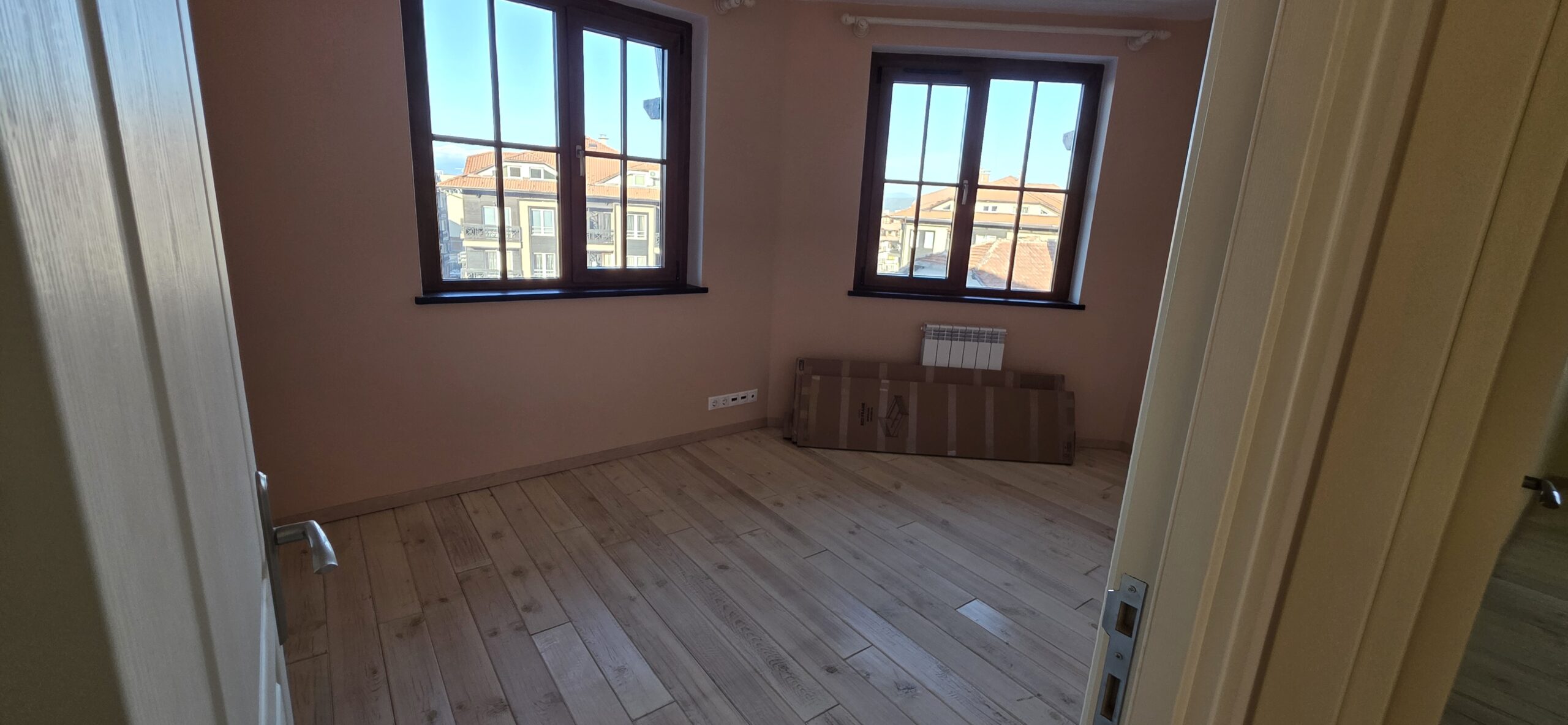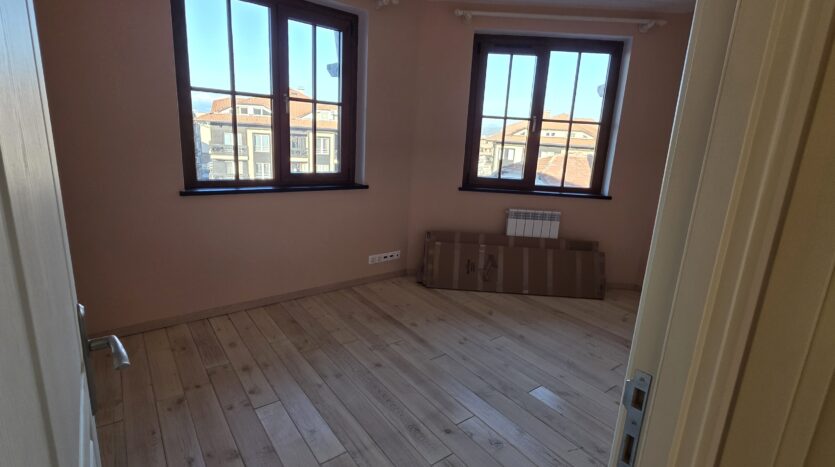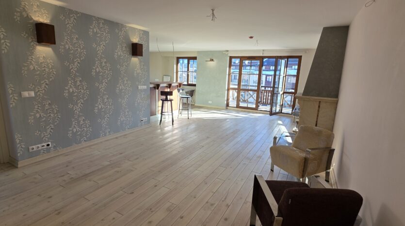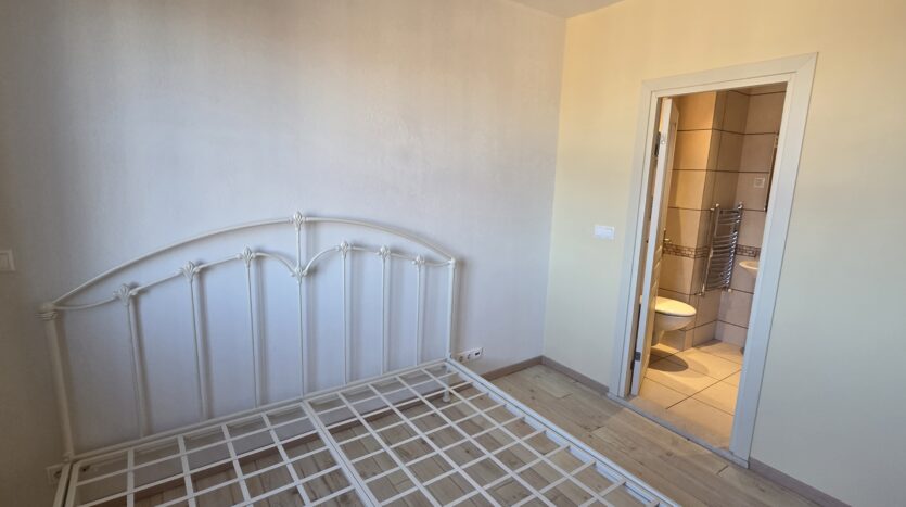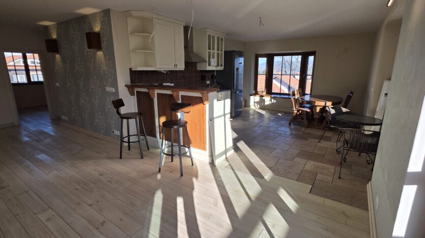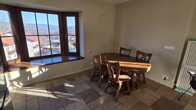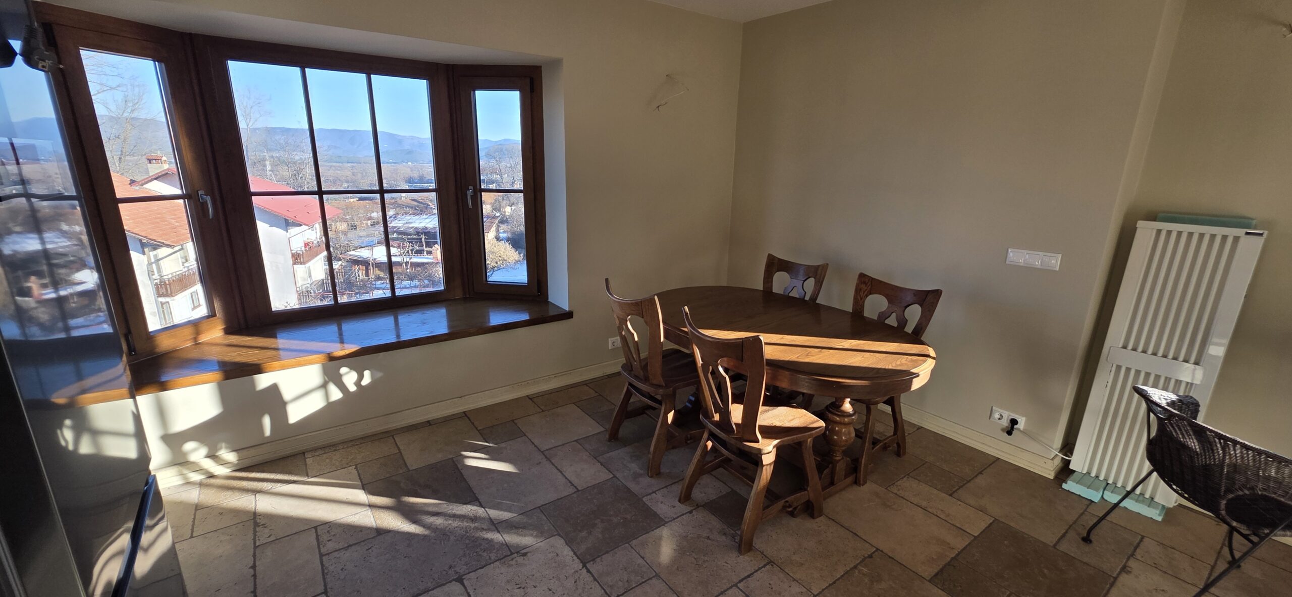 The apartment consists of an entrance hallway, spacious custom-made kitchen, made of solid wood fully equipped with an oven, gas stove, extractor and a refrigerator. The bright and spacious living/dinning area has a log- fireplace and is beautifully furnished with a dining table with chairs and armchairs. There is an access to a South-facing balcony with an amazing panoramic views of Pirin mountains. The main bedroom is furnished with a double bed and has an en-suite bathroom equipped with a bathtub, sink and toilet. The second bedroom is unfurnished, with two large East-facing windows. The second bathroom is equipped with a shower, sink and a toilet.