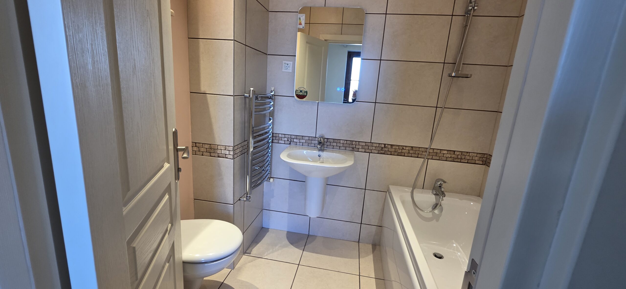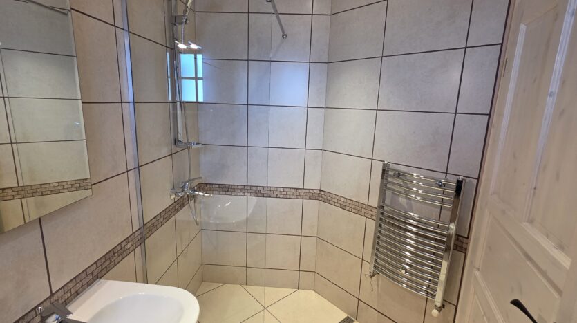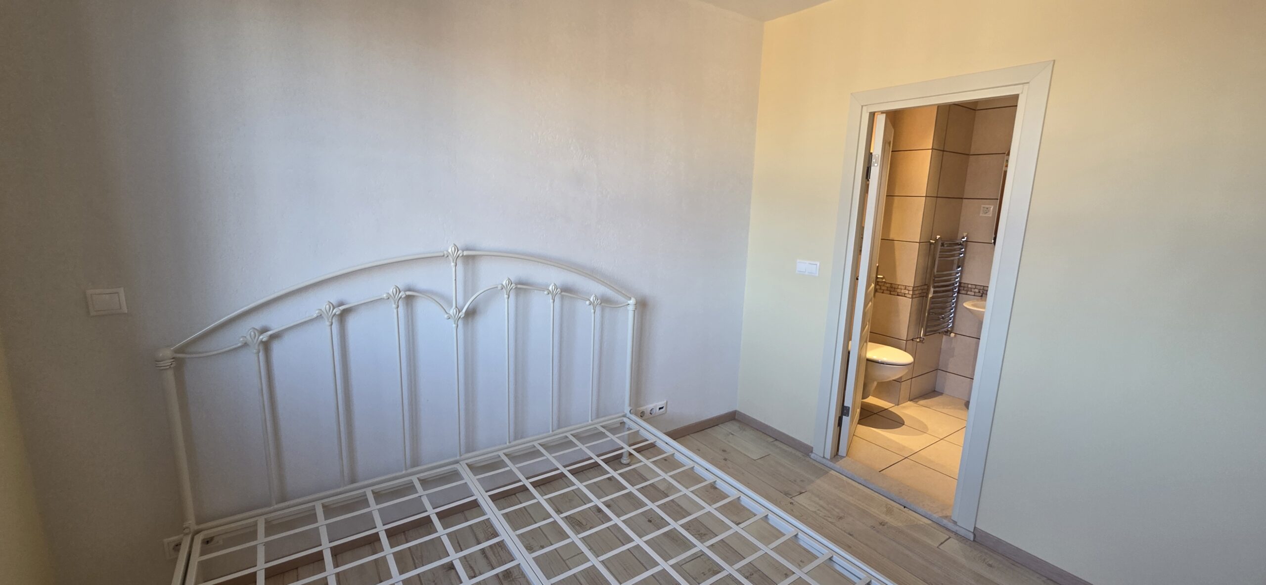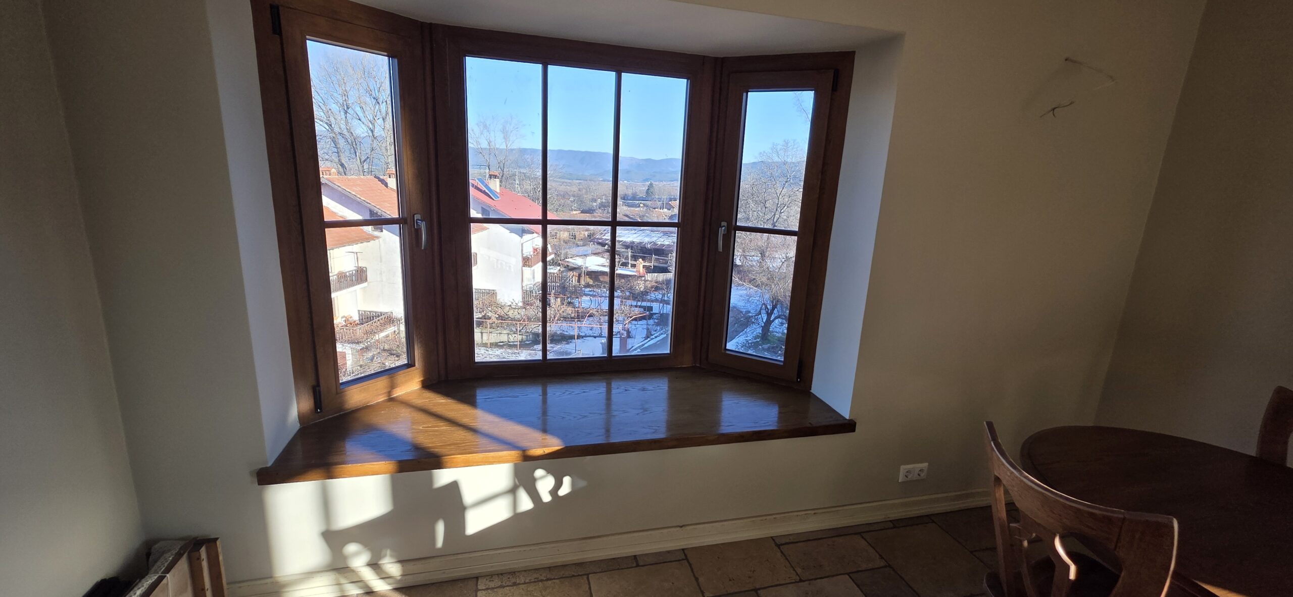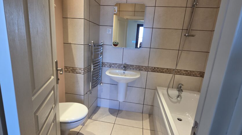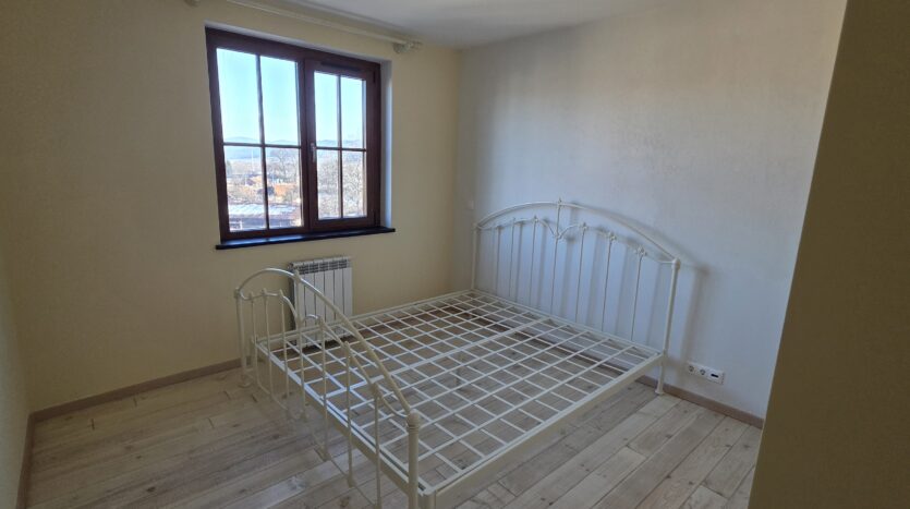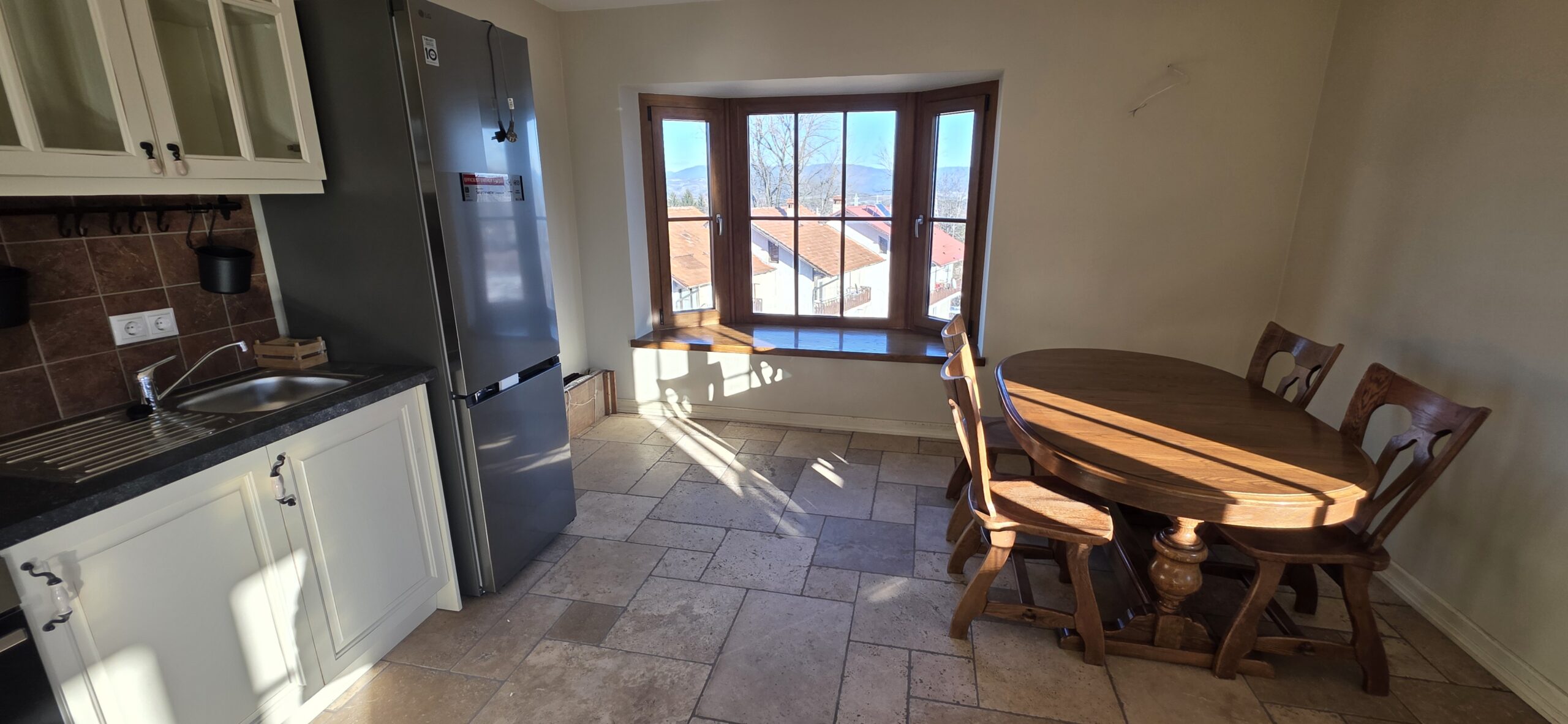 The apartment consists of an entrance hallway, spacious custom-made kitchen, made of solid wood fully equipped with an oven, gas stove, extractor and a refrigerator. The bright and spacious living/dinning area has a log- fireplace and is beautifully furnished with a dining table with chairs and armchairs. There is an access to a South-facing balcony with an amazing panoramic views of Pirin mountains. The main bedroom is furnished with a double bed and has an en-suite bathroom equipped with a bathtub, sink and toilet. The second bedroom is unfurnished, with two large East-facing windows. The second bathroom is equipped with a shower, sink and a toilet.