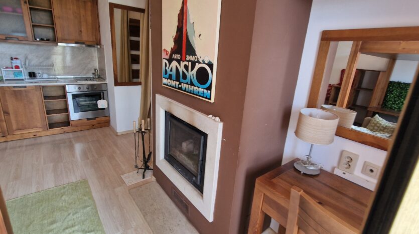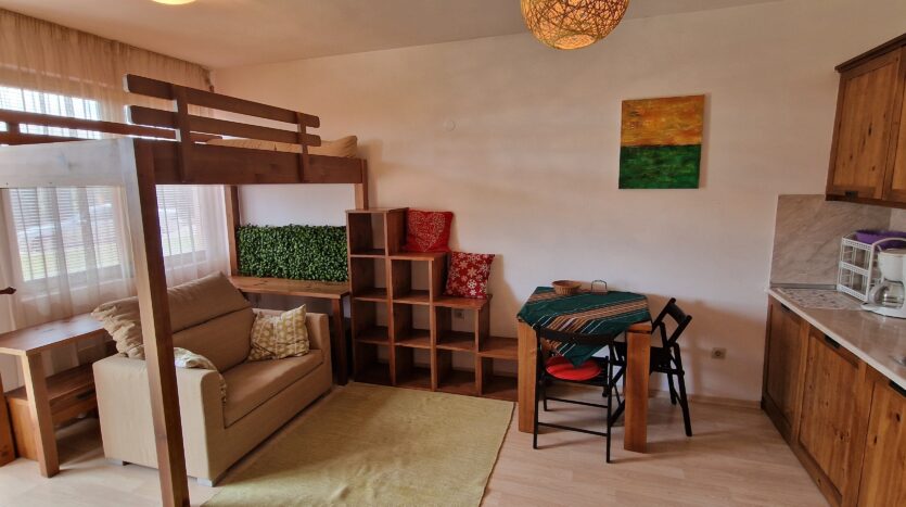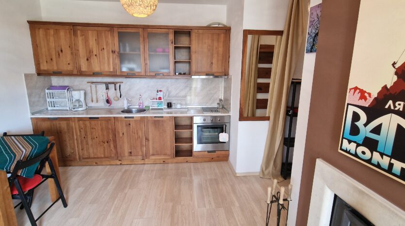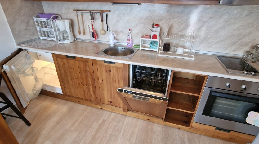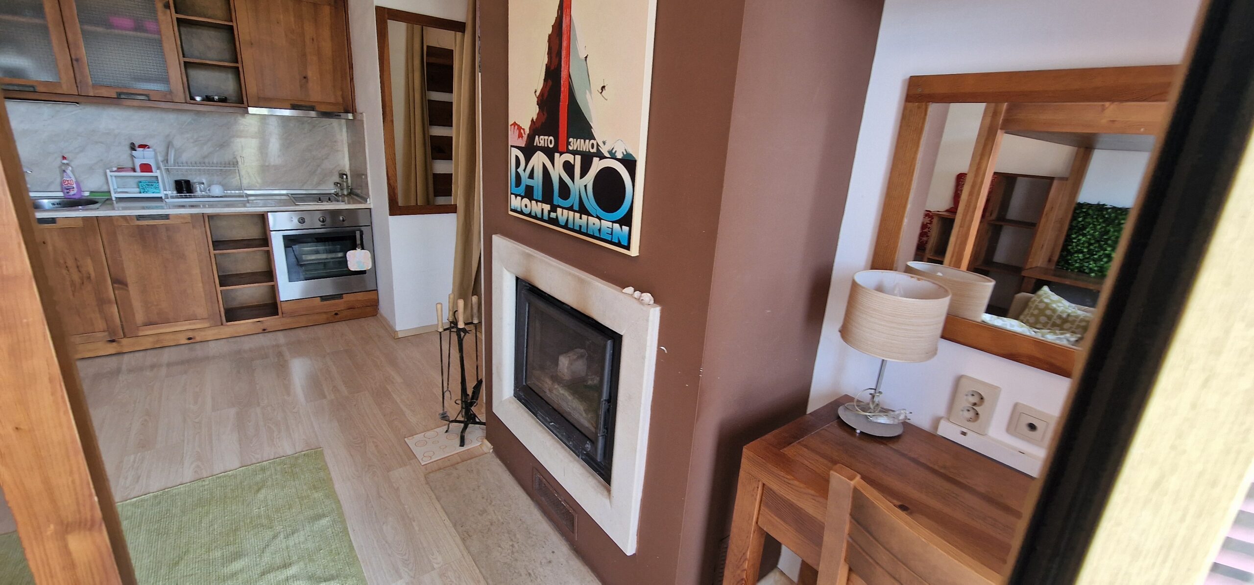 The apartment consists of an entrance hallway, a living/bedroom with a fully equipped kitchene with an oven, ceramic hob, extractor, dishwasher and a fridge, a dining area, a double bank bed, a desk, an armchair and a log fireplace. There is an access to an East-facing balcony with beautiful views.