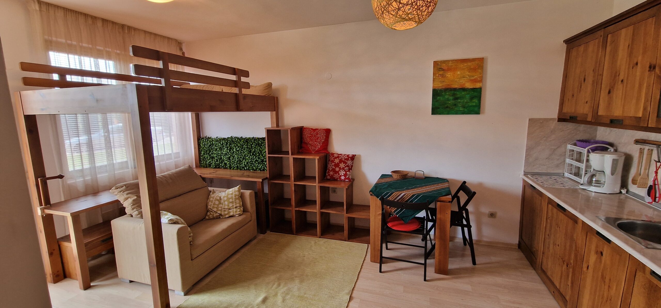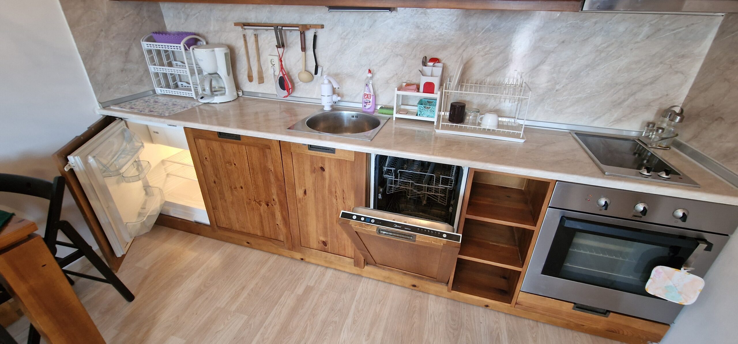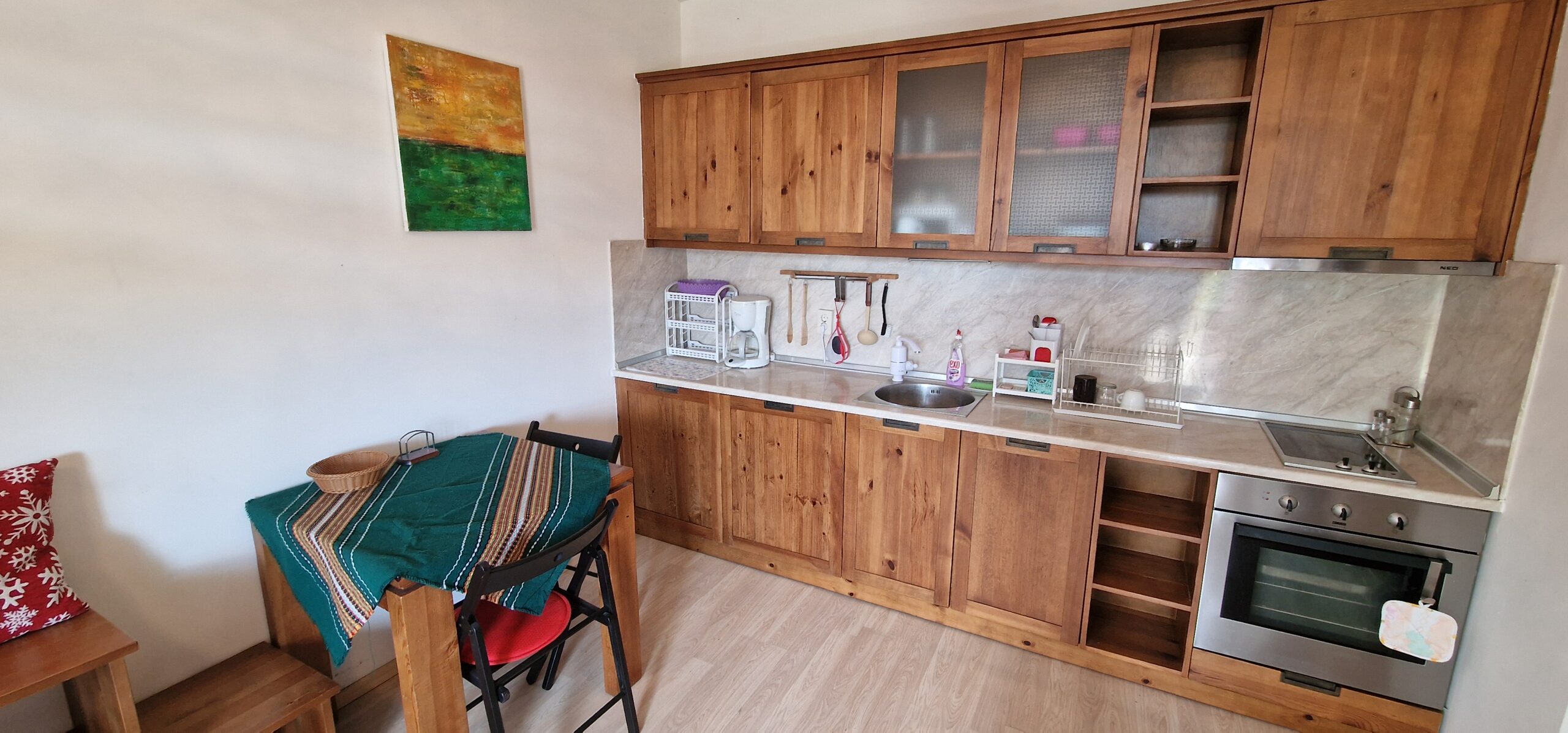 The apartment consists of an entrance hallway, a living/bedroom with a fully equipped kitchene with an oven, ceramic hob, extractor, dishwasher and a fridge, a dining area, a double bank bed, a desk, an armchair and a log fireplace. There is an access to an East-facing balcony with beautiful views.